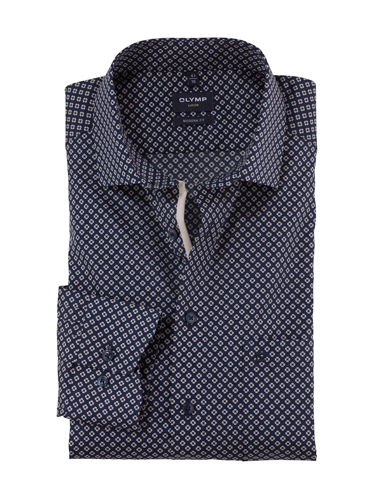 Modern fit overhemd van Olymp in een all-over dessin met lange mouwen, kent kraag, knoopsluiting en een opgestikte borstzak. Materiaal: Katoen 100%