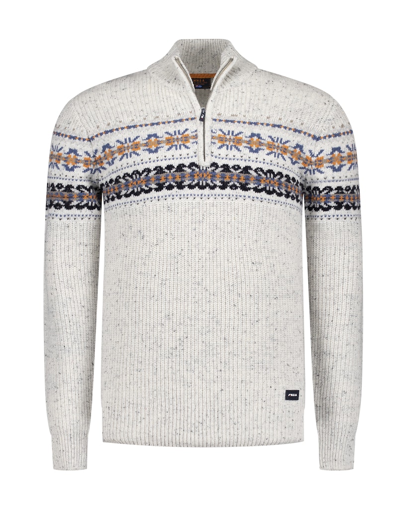 Gemêleerde trui van N.Z.A. met een ingebreid patroon aan de bovenzijde, opstaande kraag voorzien van korte ritssluiting en ribgebreide boorden.