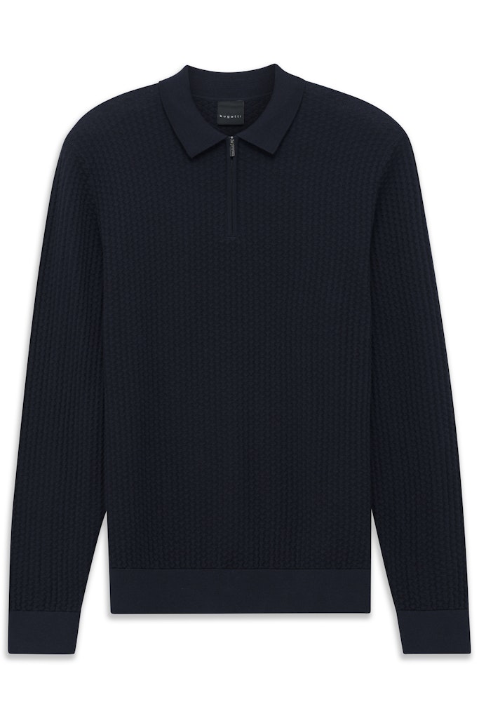Trui van Bugatti in een ribstructuur met lange mouwen, polokraag voorzien van korte ritssluiting en ribgbreide boorden. Materiaal: Katoen 100%