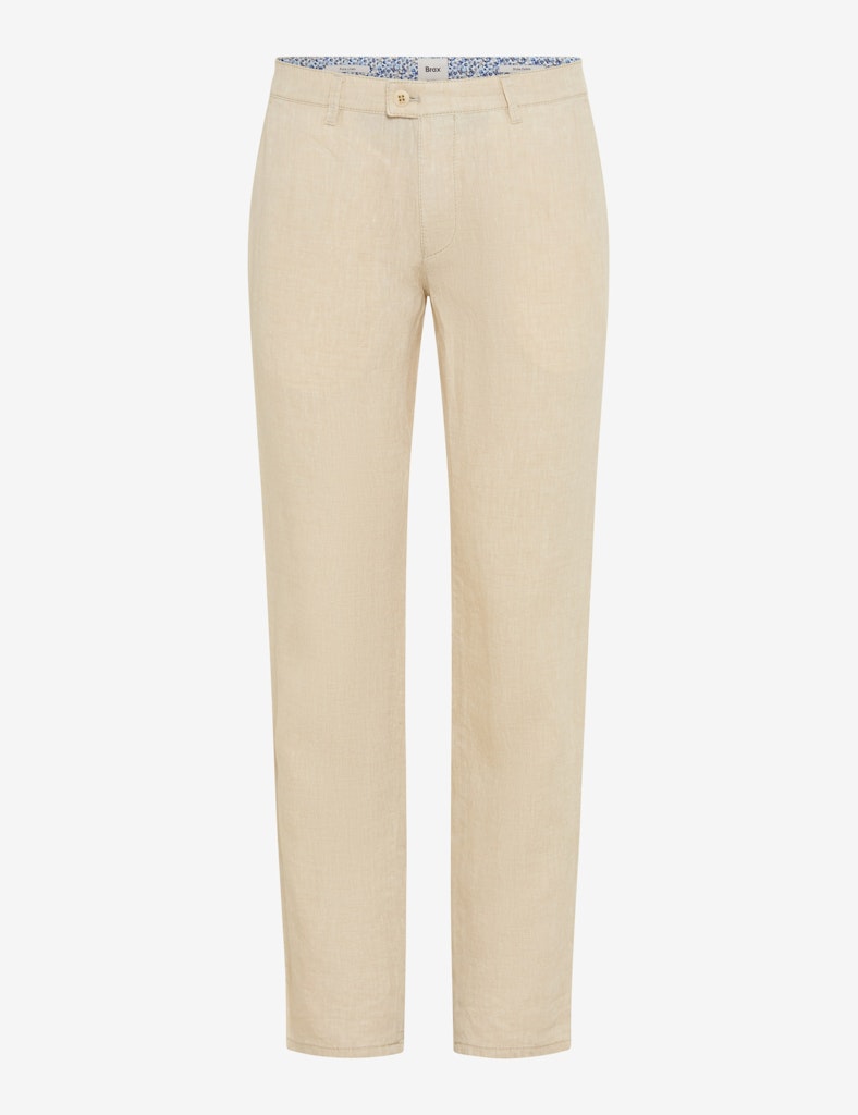 Linnen chino van Brax met een knoop- en ritssluiting, steekzakken en twee paspelzakken aan de achterzijde. Materiaal: Linnen 100%